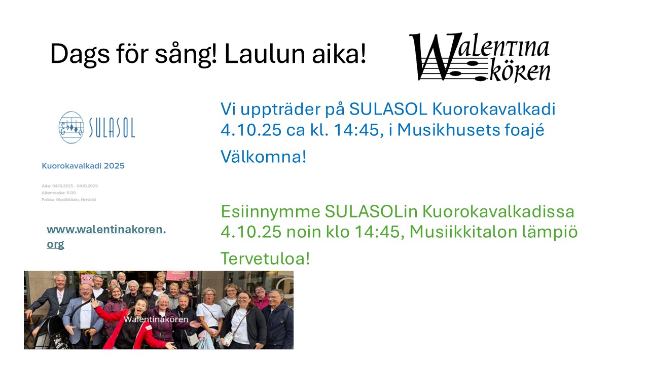 Walentinakören har ny dirigent från februari 2025. Hon heter Kati Sannelvuo och hon är bl.a. pianist, kompositör, sångare, dirigent.