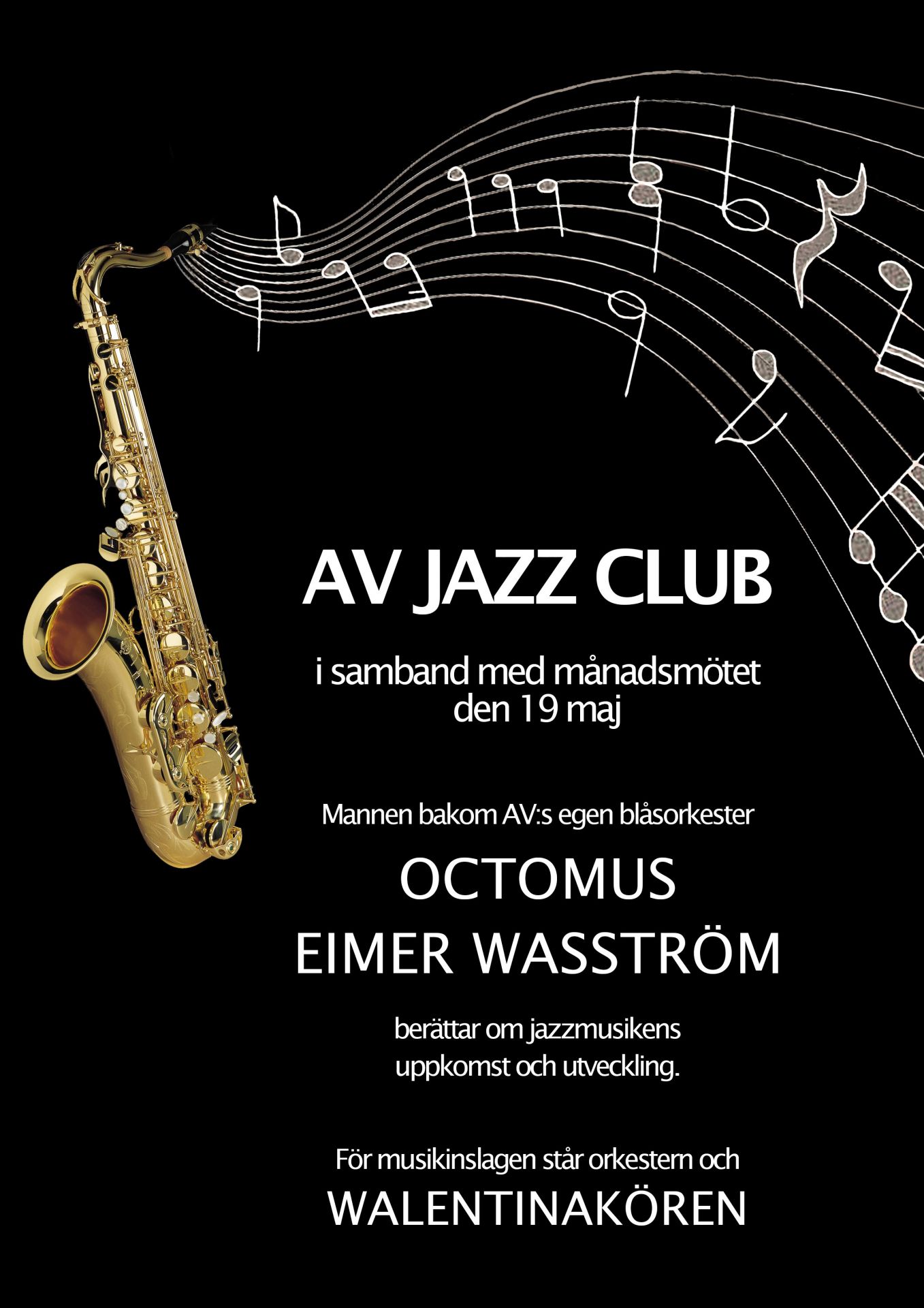 Programmet på AV:s månadsmöte 19.5.2019 var mer än vanligt svängigt, för då ställde Walentinakören och körens egen orkester Octomus till med Jazz Club.